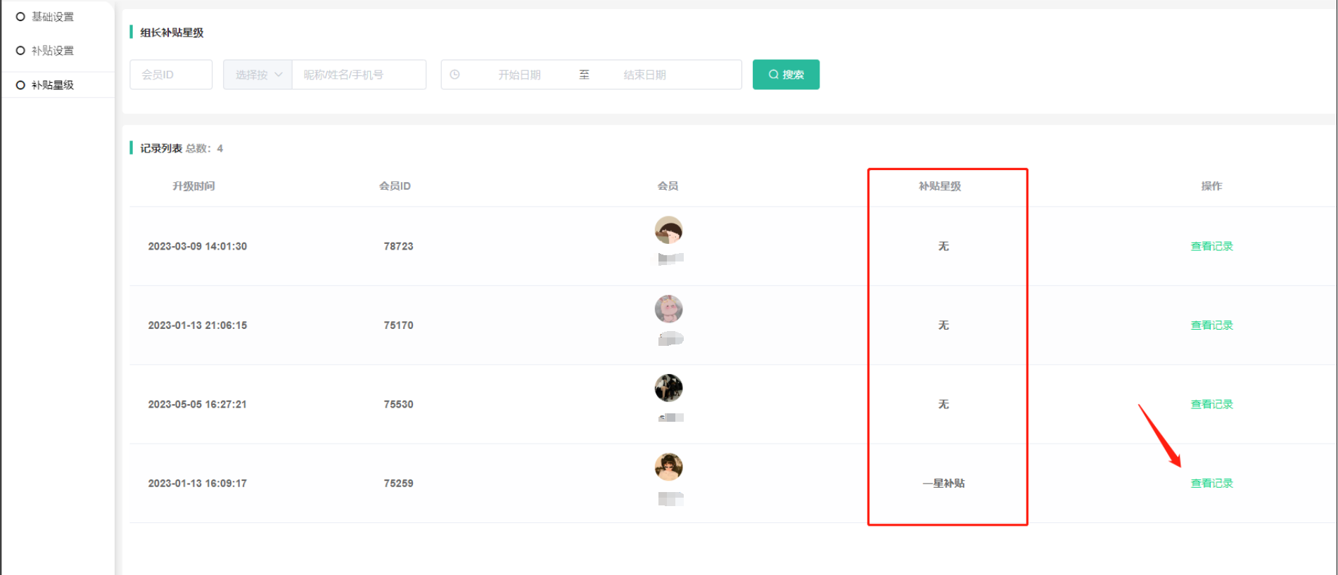 记录列表显示升级时间,会员id,会员昵称,补贴星级,查看记录~