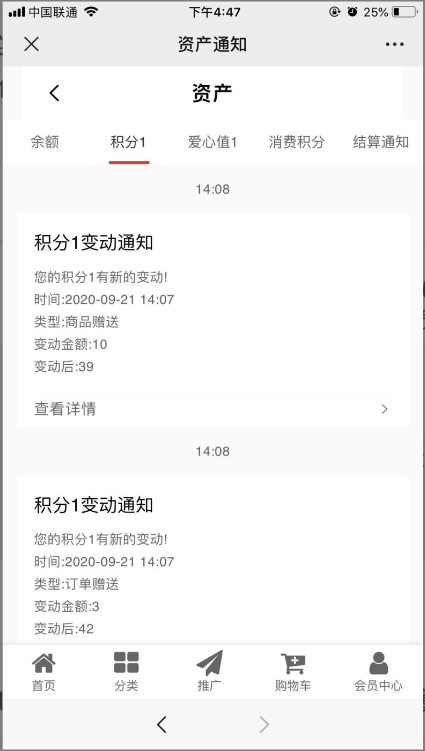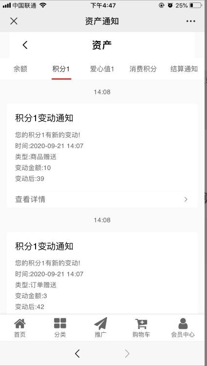 用户在前端会员中心--消息栏目中可以查看交易物流、提现通知、申请通知、客户通知、资产通知、服务通知、订单提醒、客服通知、后台推送的活动优惠等信息。