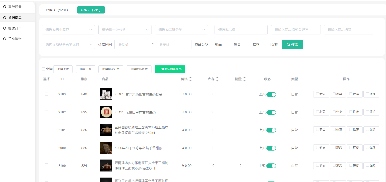 2、一键推送同步商品(把商城自营全部未推送的商品推送到第三方)