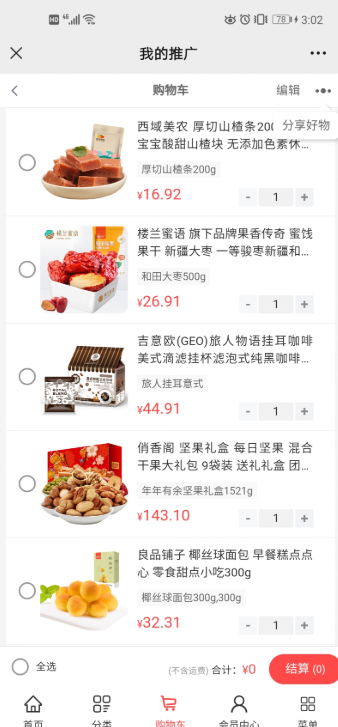 2、点击右上角-分享好物。后台不开启购物车分享则不显示此选项。