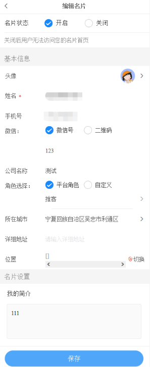 1,拥有权限的会员可在前端—会员中心看到名片入口,点击进入即生成了自己的名片,生成的名片名字默认为会员昵称,角色默认为会员,等级为会员等级,可在名片编辑处对自己的名片进行修改;只有在名片编辑处填写了手机号、微信号、地区,才可以在名片中心查看到相关信息