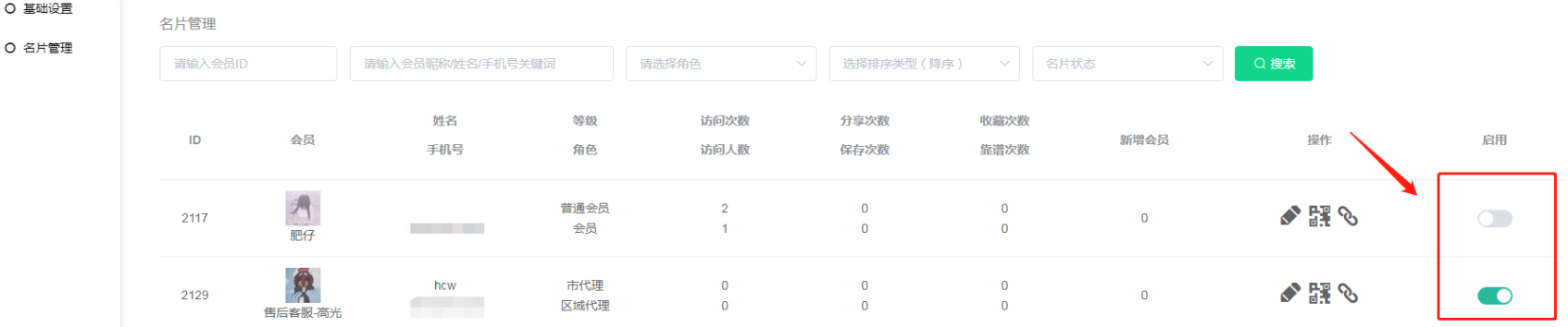 3,可按照会员id/昵称/姓名/手机号、角色、类型、名片状态进行筛选【靠谱次数为点赞次数】